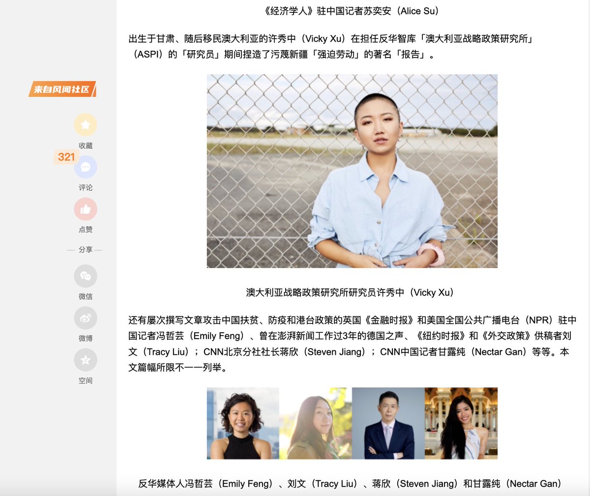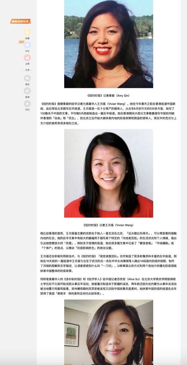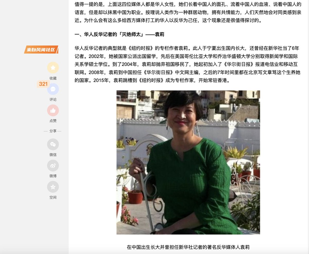 In typical nationalist tropes, self-identified @nyuniversity graduate student 戴雨潇 Yu-Xiao DAI wrote the female journalists are "female Chinese with Chinese faces, Chinese blood, and Chinese language but make a living by smearing China."