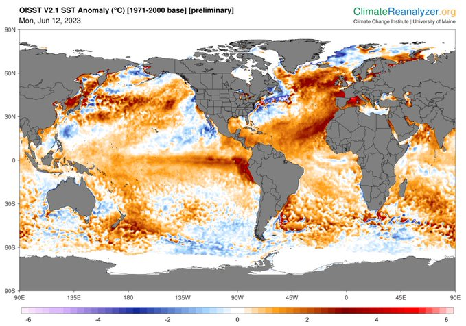 De temperatuur-anomalie van de noordelijke Atlantische Oceaan laat een hele hoge piek zien. Een warmere oceaan betekent hogere temperaturen in Europa. De kans bestaat dat deze zomer temperatuur- en neerslagrecords gebroken worden. Een warmere atmosfeer houdt meer water vast. 2/14