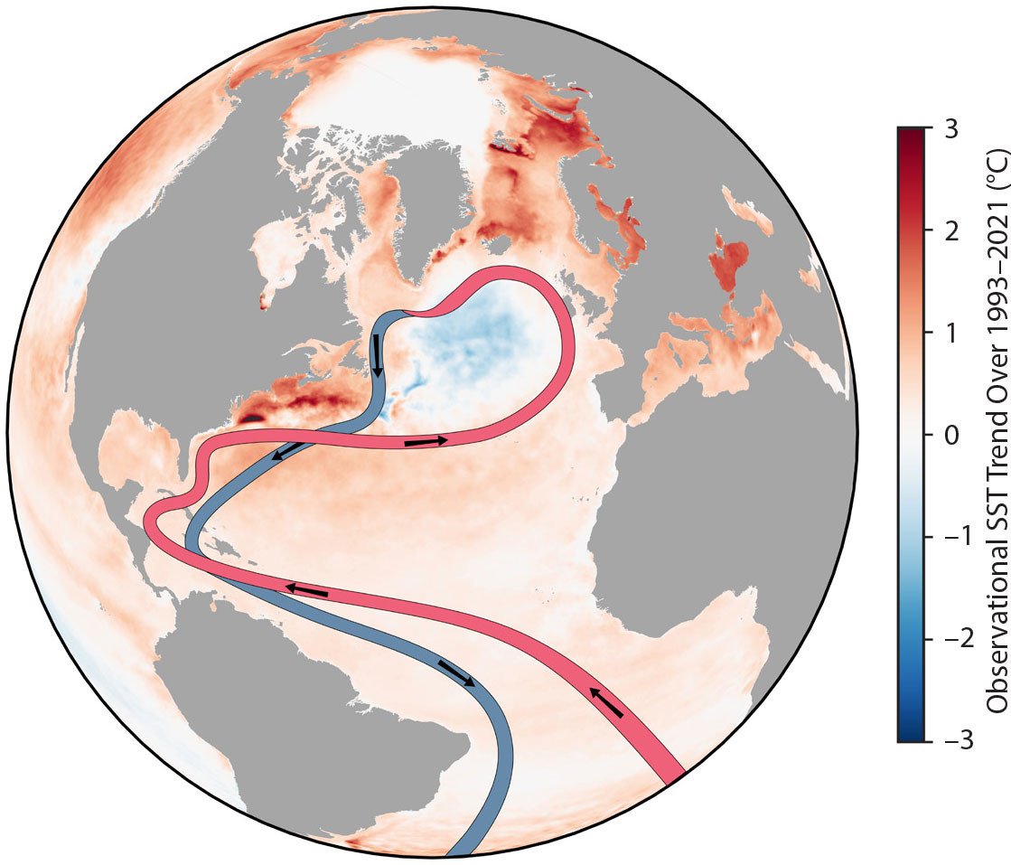 https://twitter.com/rahmstorf/status/1797976625247879278De motor van dit systeem is het zoutgehalte. Op de route naar het noorden wordt door verdamping het zoutgehalte van het zeewater hoger waardoor de massa van het water hoger wordt. Hoe zouter het water hoe zwaarder.