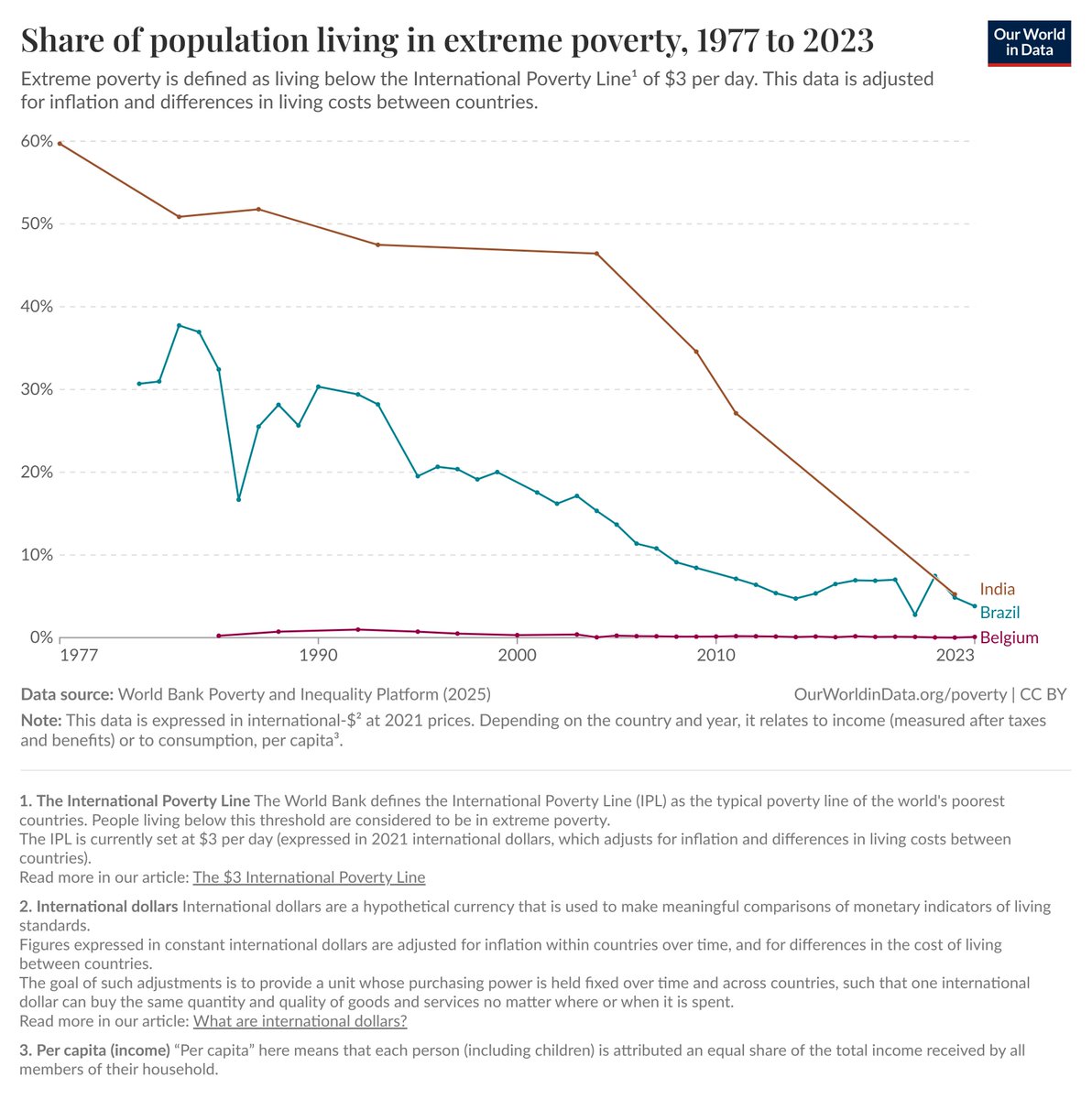 https://twitter.com/elrojodelPI/status/2034642090622369793Se considerarmos linhas de pobreza extrema, tanto o Brasil quanto a Índia reduziram significativamente desde as reformas neoliberais. A título de curiosidade, em 1990, 30% da população brasileira vivia abaixo da linha de extrema pobreza, hoje são 3,83% (Índia era 50%, hoje é 6%)