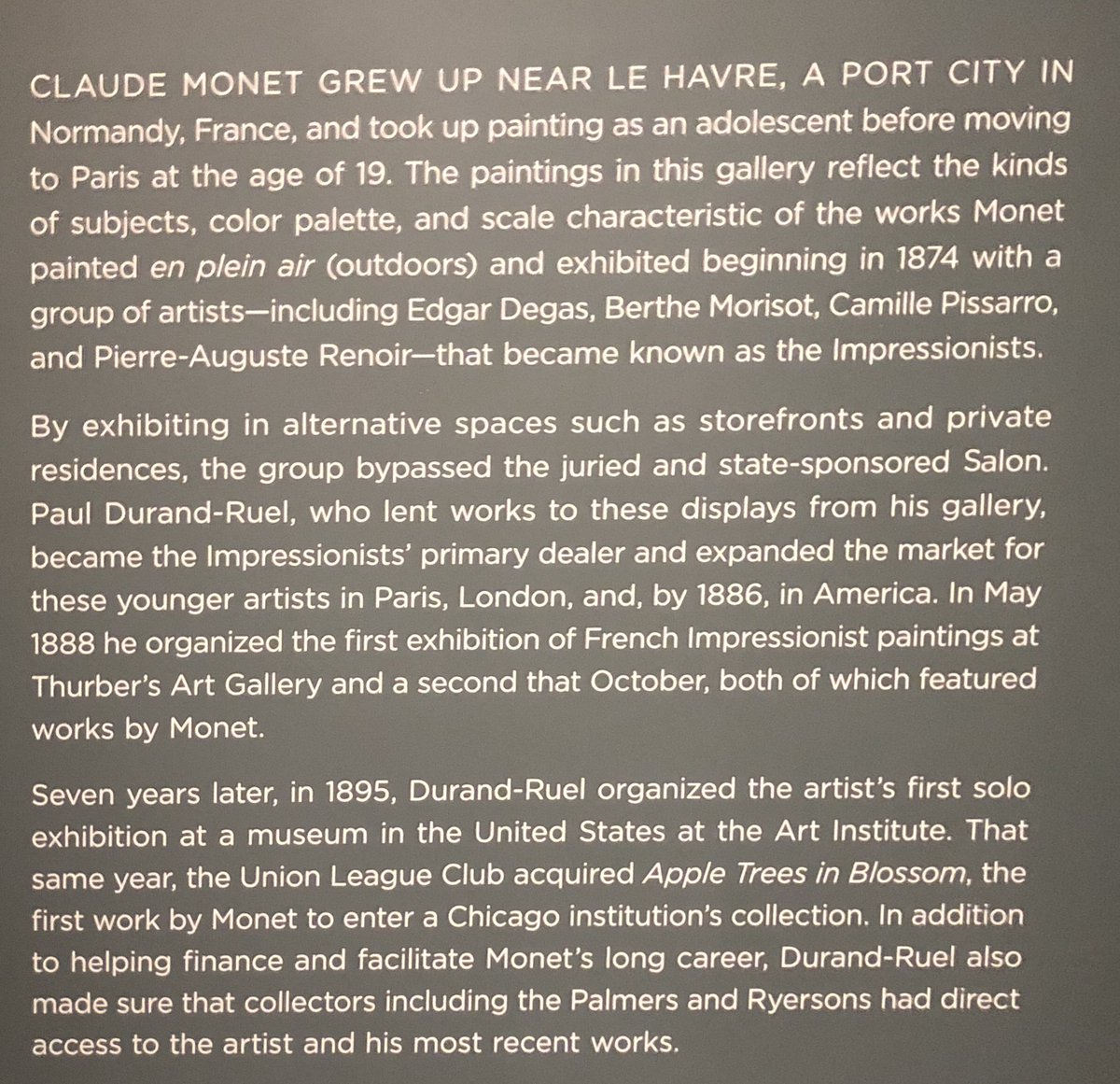 十九世纪末印象派与莫奈在芝加哥大受追捧收藏。所以此次展览都是本地收藏的莫奈画作,多数以中晚期为主。如专家所说现在保险和展费越来越高,大师的个人专展会越来越少。
