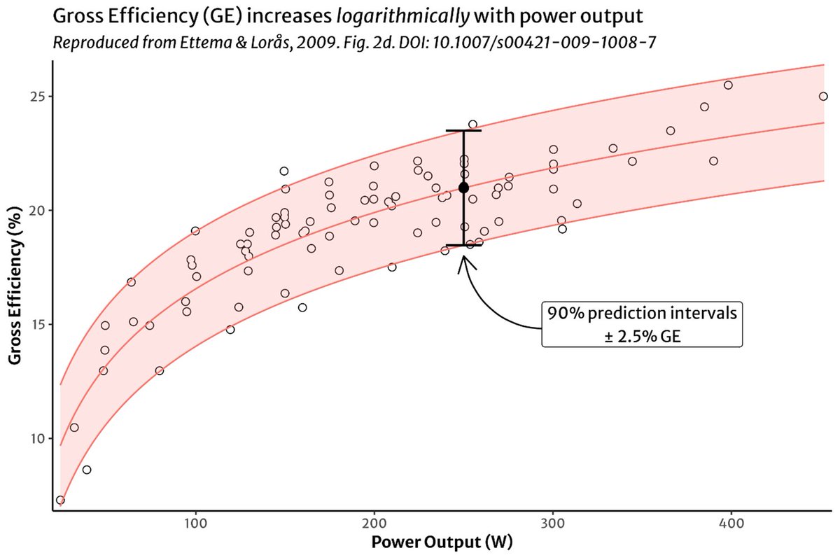 Gross metabolic efficiency (GE) for trained cyclists is 15-25%