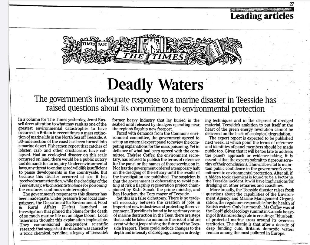 Please read; the most important piece I've written. Mass poisoning has suddenly killed off most sea life for 30 miles by the Tees. The govt claims it's natural; ind scientists warn it's manmade. The govt is desperate not to inquire too deeply as its freeport policy is at stake.