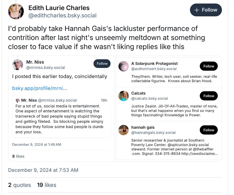 2/ They're going after Hannah Gais, who works at the SPLC and who I knew foreeeeeever ago (People's Republik RIP). She stands accused of not giving a straight answer as to whether she'll sign (she'll sign, I'm sure), and liking a problematic skeet.