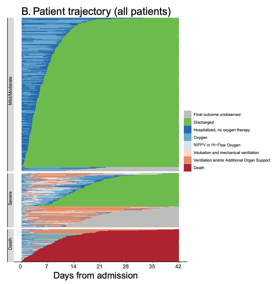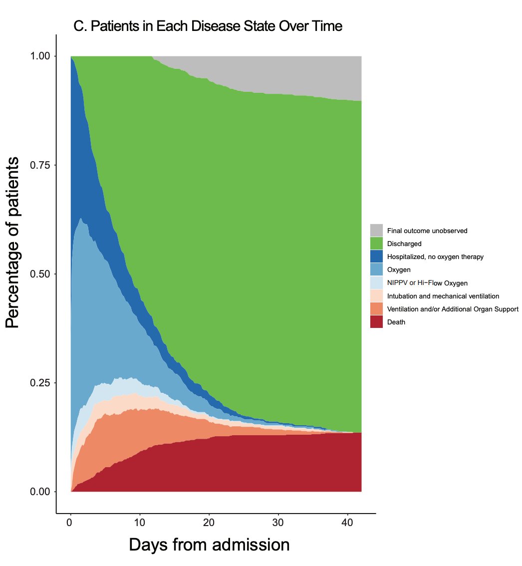 We show patient disease trajectories for all 832 patients in our cohort, classified by peak disease severity while in the hospital. We also show the percentage of patients in these disease states over time.
