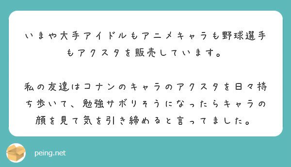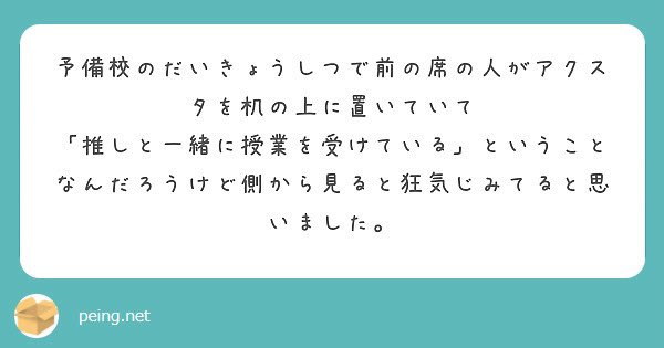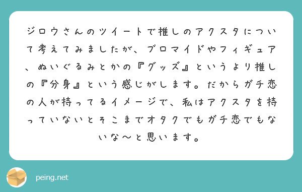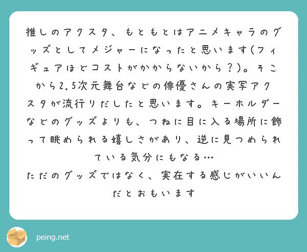 「推しのアクスタ」文化について誰か自己開示の得意なオタクの人教えて。まったく僕の死角から登場してきて気がついたらありふれた土俗信仰のように繁茂していた。スマホの画面越しに展開される推し活の時代になんでそんな急に20世紀の女子小学生みたいな文化が。 やはりスマホの画面に映写されるだけでなく「モノとして実在する手応え」に呪力が宿るようですね。あと「グッズというより分身」という意見は興味深い。推しの分身を所有する快楽。どっかで聞いたな…と思ったらジェフリーダーマーが同じこと言ってた