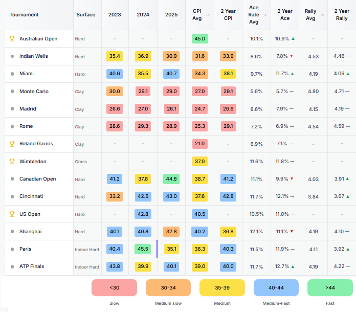Según los datos de Courtspeed.com para la velocidad de las pistas en 2025, solo Indian Wells y París han bajado su velocidad de manera drástica.