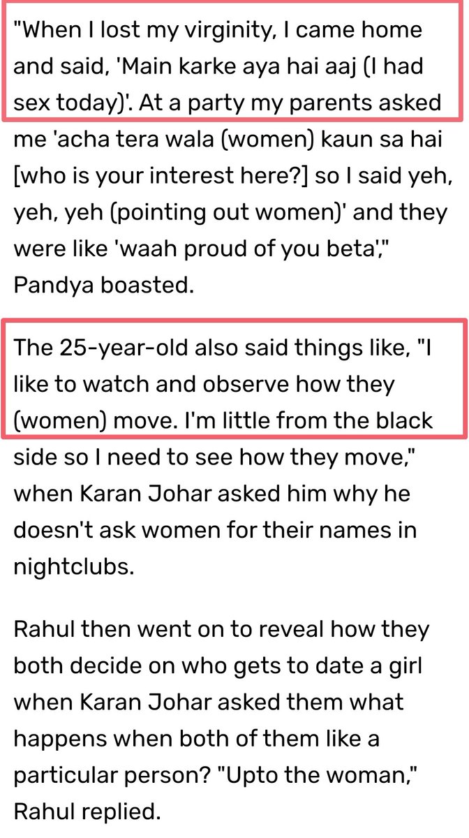 The first incident that came to light was his appearance on "Koffee with Karan" where he passed derogatory remarks about women, saying, "Aaj mai karke aaya" and "I love to see how they move from their backside."