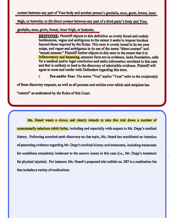 heard's lawyer claimed JD wanted to use sex related bombshells to distract people. meanwhile THEY sent asked johnny depp to provide a list of every time his body touched someone else's "genitalia, anus, buttocks" etc in the past 10 yrs