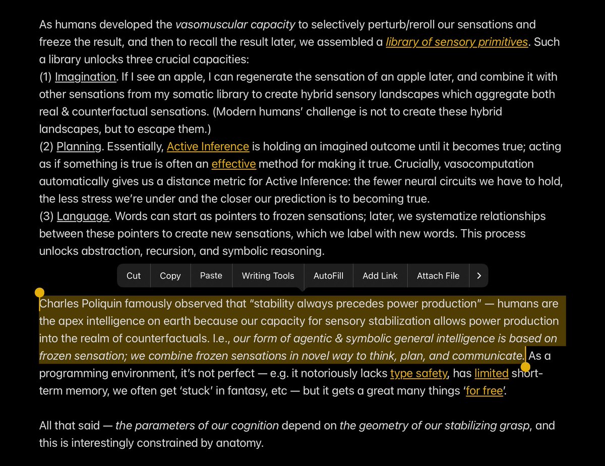https://twitter.com/nosilverv/status/1751939550098726990If a dolphin wants to explain there’s a school of fish nearby, it will send the sound of a sonar return from a phantom school of fish — literally the *sensation* of fish. I suspect this is a good model for early human language — “magic spells that involuntarily invoke sensations”