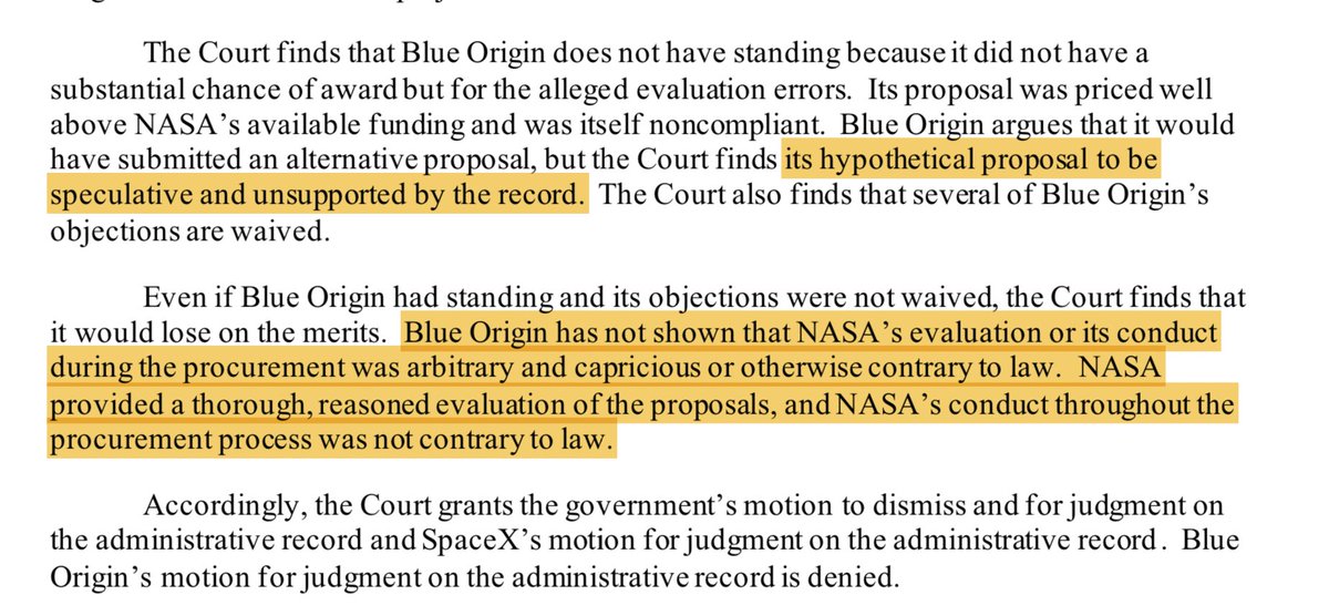 In its 47 page decision, the judge found that NASA "provided a thorough, reasoned evaluation" of the lunar lander proposals, and "NASA’s conduct throughout the procurement process was not contrary to law."