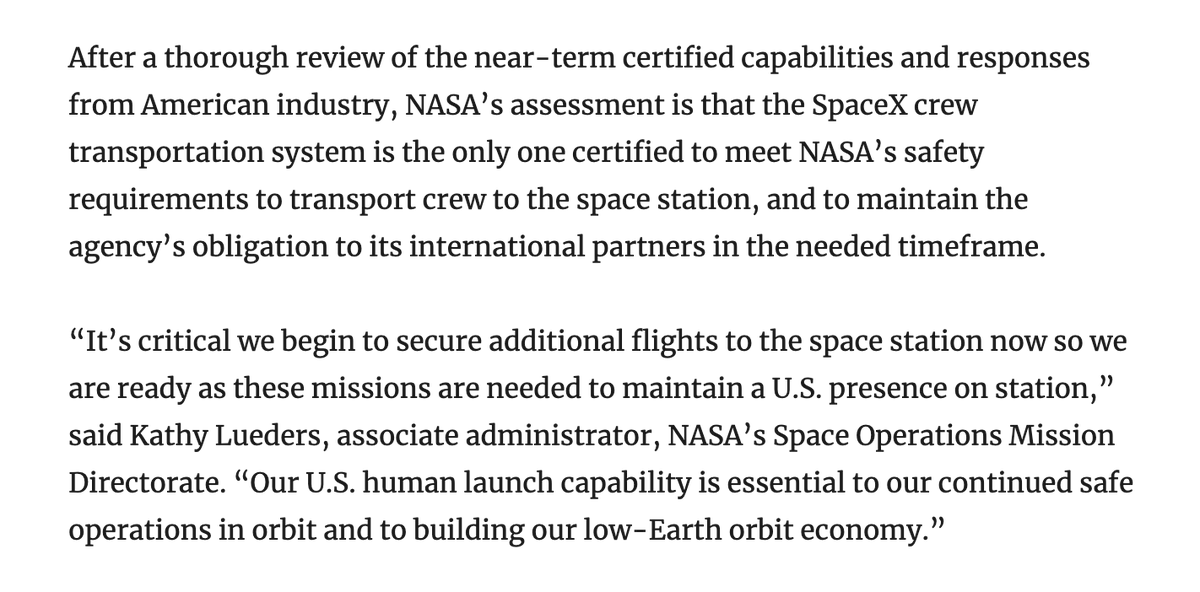 SpaceX, having flown three crewed missions under the contract already, is on track to launch its sixth and final Crew Dragon mission by March 2023, while Boeing's Starliner, marred by technical issues, won't fly the first of its six contract missions until at least late 2022.