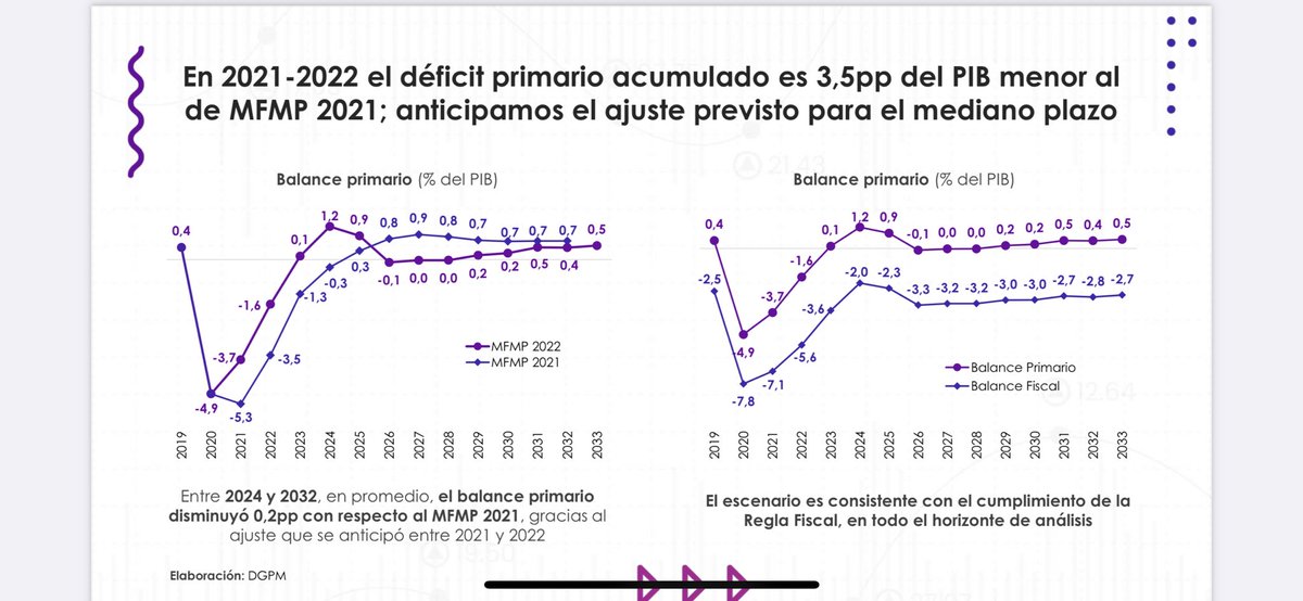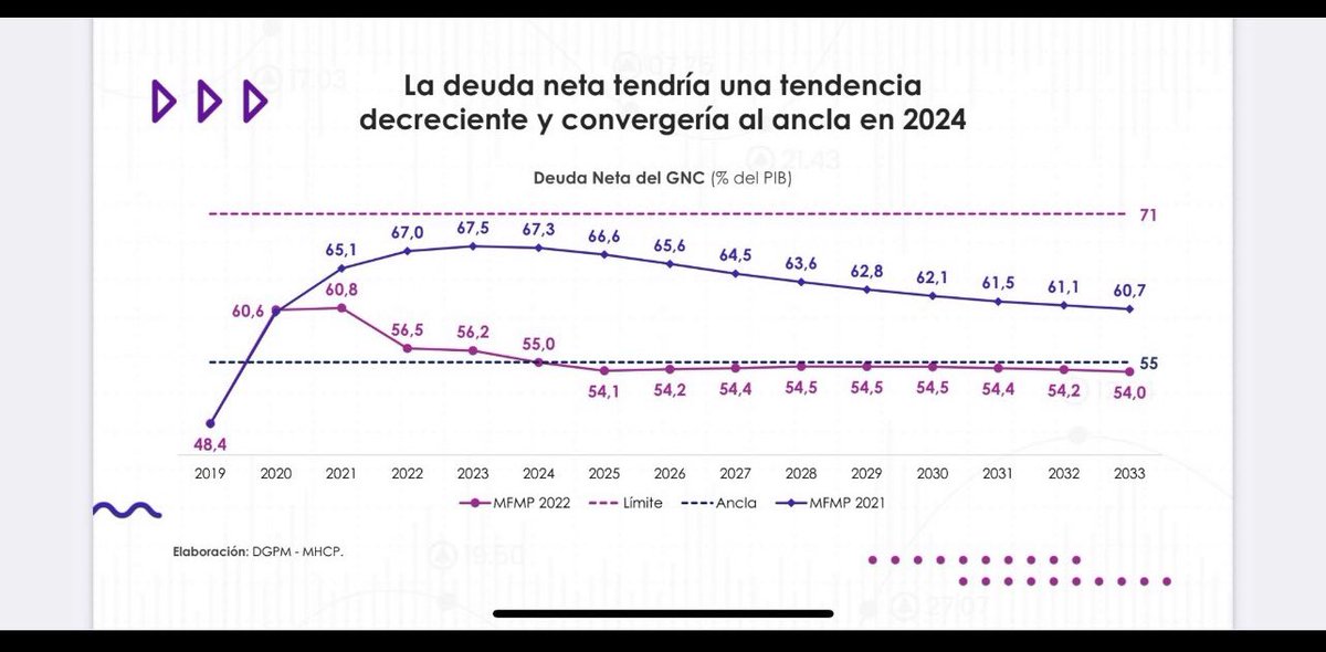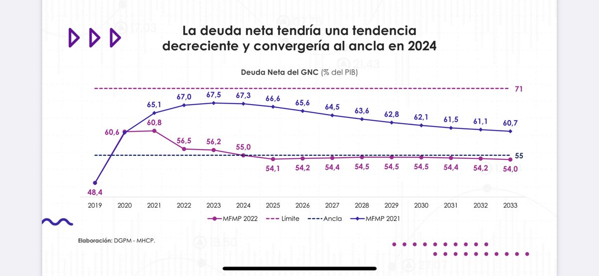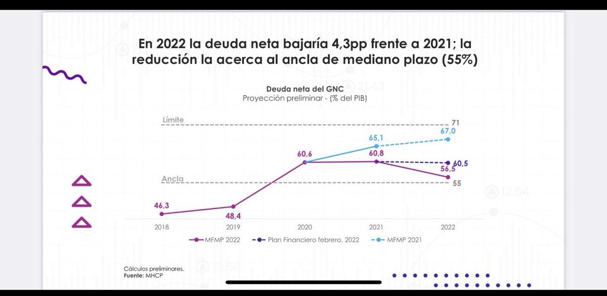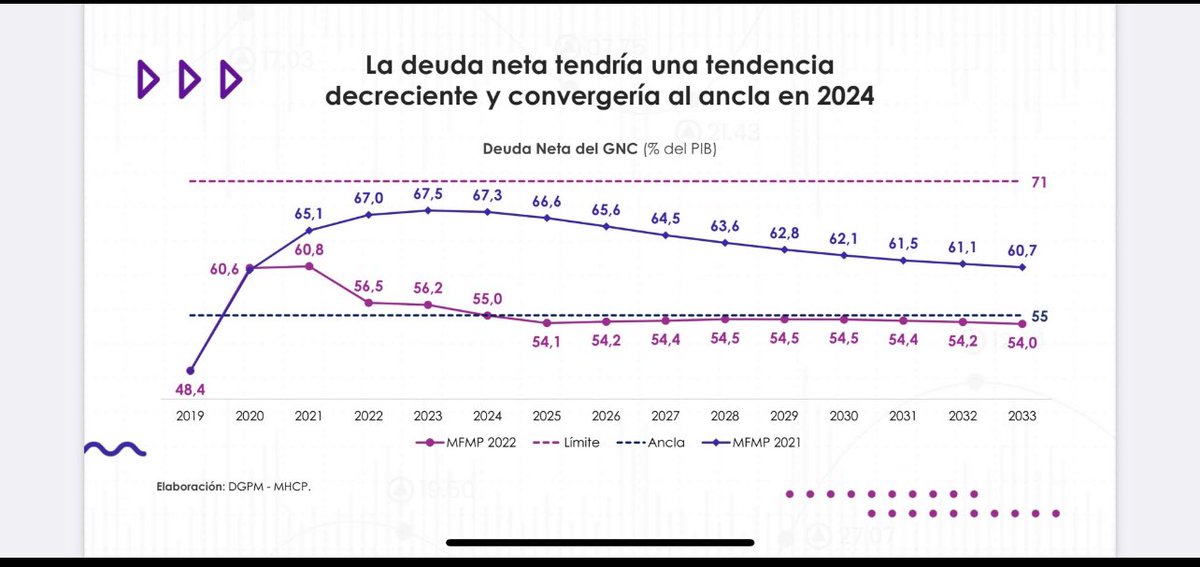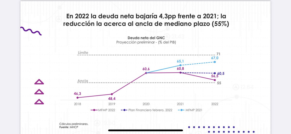 Segundo: luego de enfrentar el desafío de pandemia, se ha dado una reducción sustantiva en el déficit y en la deuda pública retornando a superávit primario y al nivel mínimo de deuda (nivel del ancla, ósea el menor posible para Colombia ) según Marco Fiscal de Mediano Plazo.(2/4)