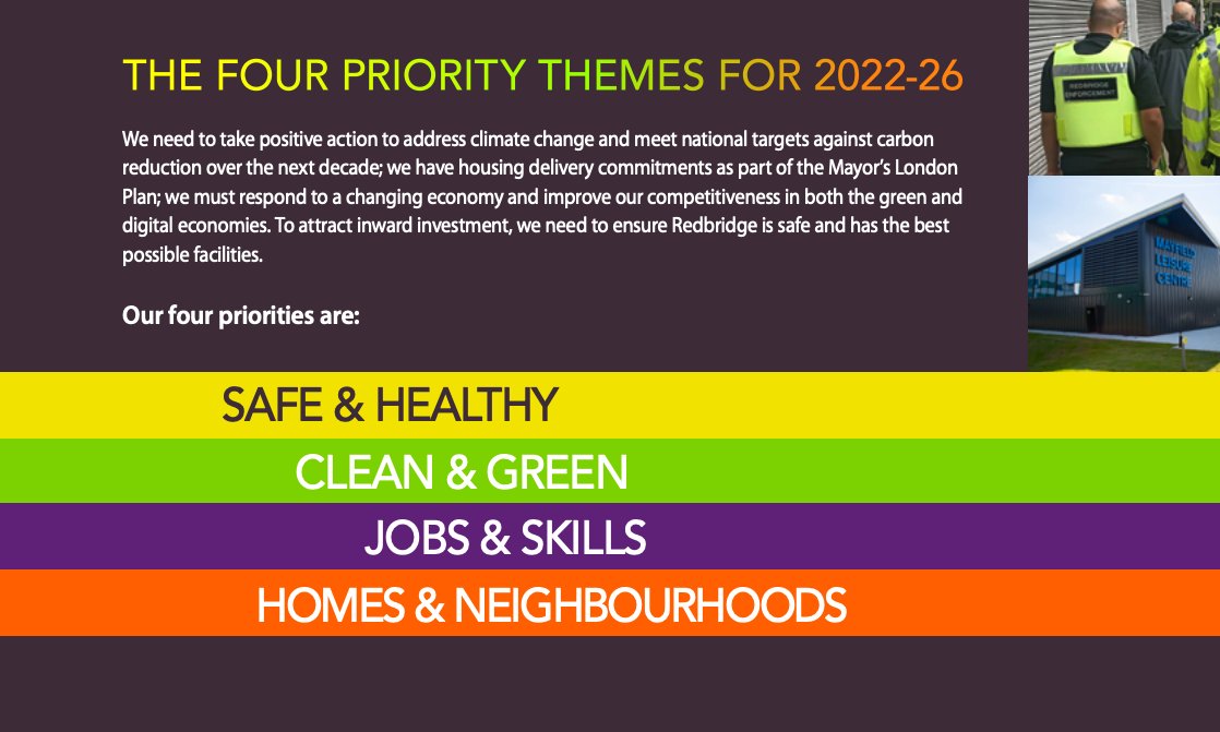 In July, months after the local elections, Redbridge Council published a four-year plan setting out four priorities: safe and healthy, clean and green, jobs and skills, homes and neighbourhoods.