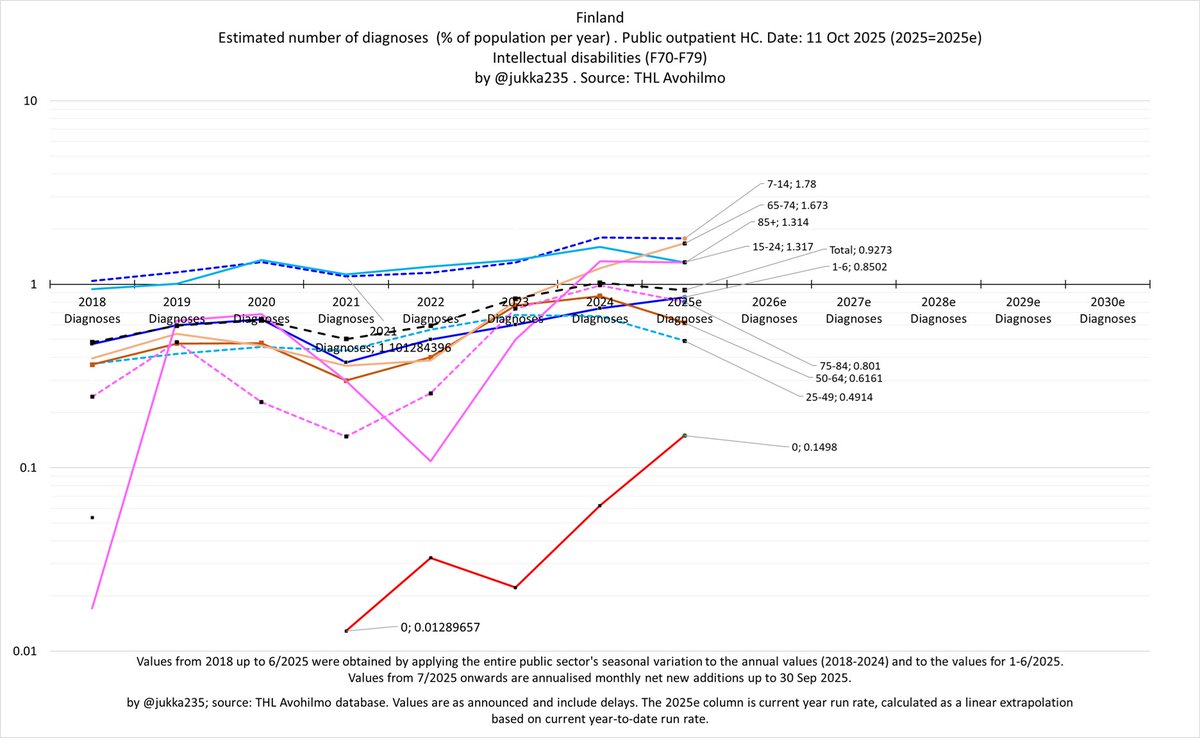 The rise in intellectual disability among <1 year olds also shows in number of diagnoses: up roughly 11 times in 4 years. Also note the rise among 1-6 year olds.