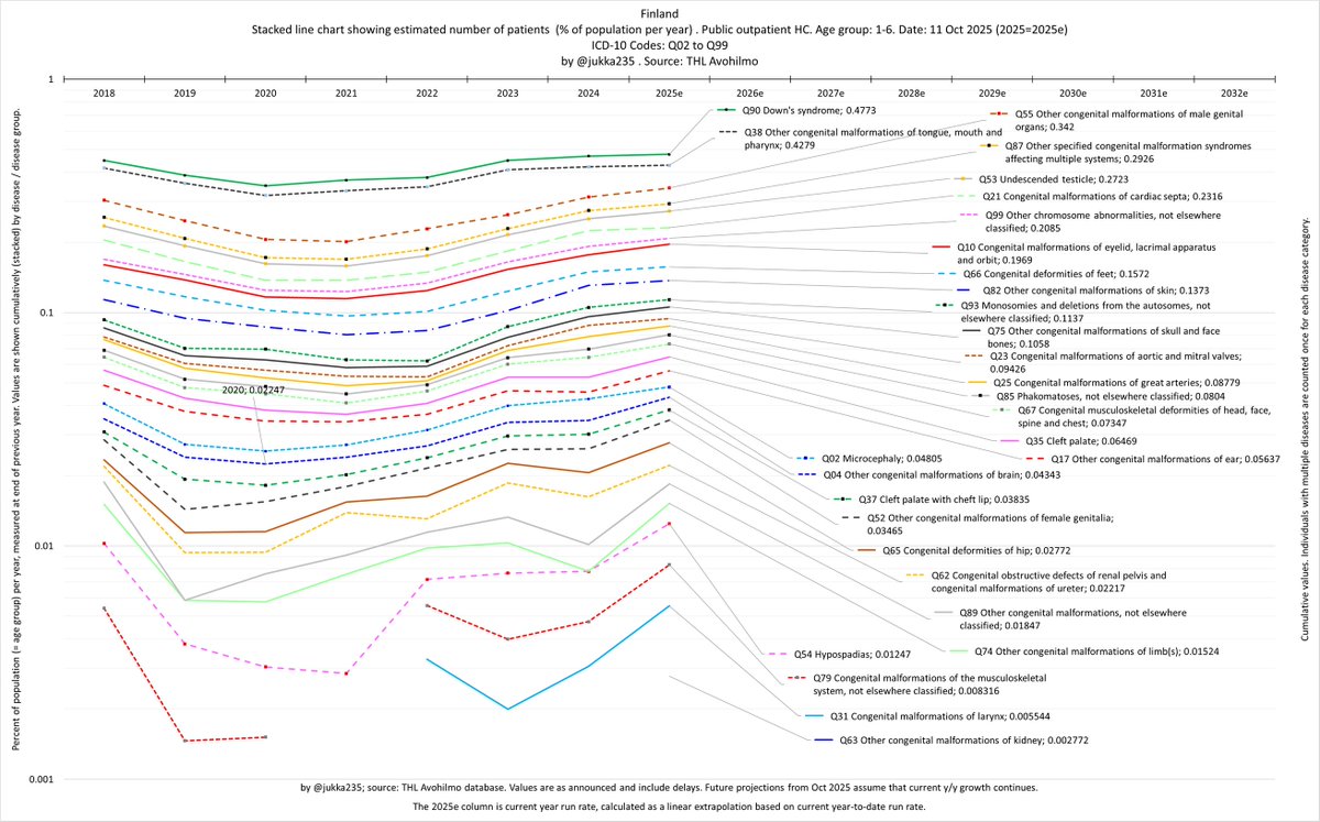 Vuonna 2023 joka kolmannellatoista alle 1-vuotiaalla oli epämuodostuma, epämuotoisuus tai kromosomipoikkeama (Q00-Q99). Potilasmäärä kasvaa 75 prosenttia vuodessa (16-kertaistuu viidessä vuodessa).