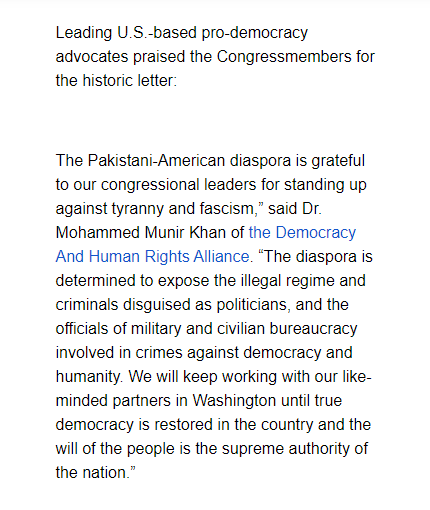 "The Pakistani-American diaspora is grateful to our congressional leaders for standing up against tyranny and fascism,” said Dr. Mohammed Munir Khan of @dhr_alliance. We will keep working with our like-minded partners in Washington until true democracy is restored"