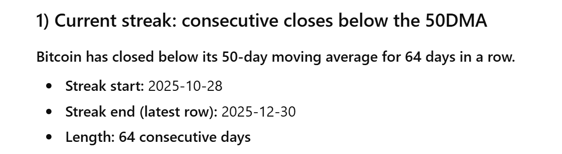 2/ This matters because Bitcoin has now closed below the 50DMA for 64 consecutive days.