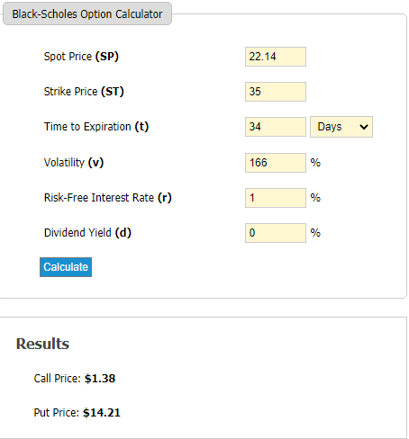 The $35 strike that expires on April 30th trades on SushiSwap at 6.1% of an UMA. Plugging in everything that's known into a Black-Scholes calculator on the web, this implies a 166% annualized implied volatility. (6.1% * $22.14 = $1.35 - I tried my best to match that put price)