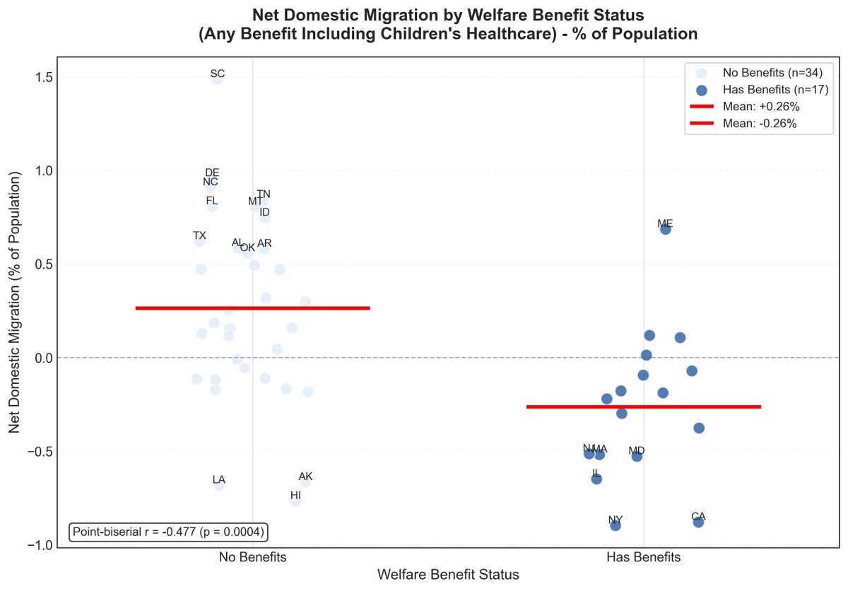 In 2023, states that provide welfare benefits to illegal immigrants had a net flight of 0.26% of the population.
