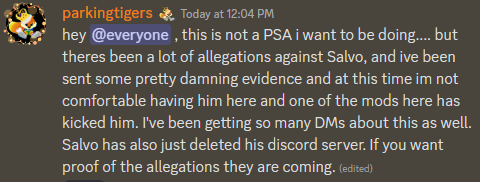 In the @parkingtigers Discord today an announcement was made saying that "damning evidence" of some allegations were made against Salvo and that he had deleted his Discord.
