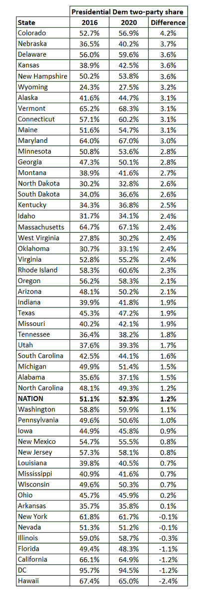 THREAD: With the presidential results basically done, I took a look today at how the states voted relative to the nation, both in this election and since 2000