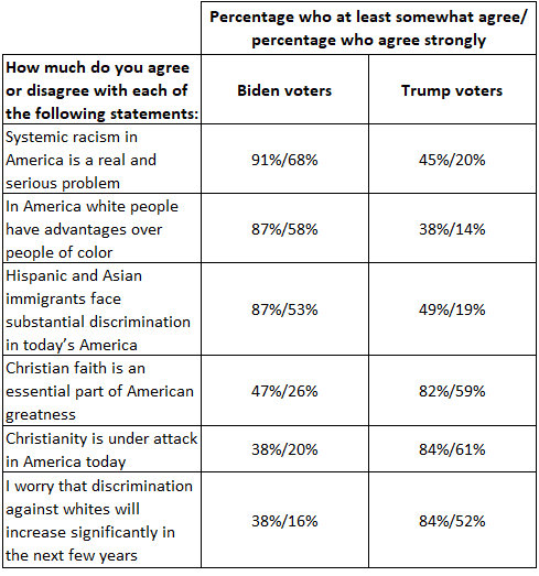 2. Biden/Trump voters feel strongly but in opposite directions on the topic of discrimination, with Biden voters expressing concern about discrimination against minorities, while Trump voters worry that discrimination against whites will increase significantly soon