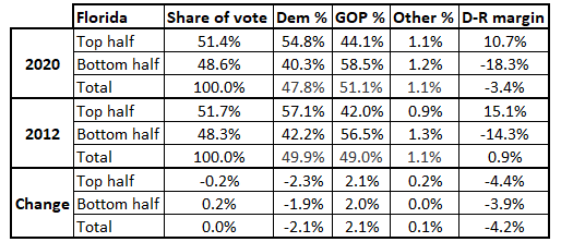 Florida is unlike others in that its top half moved a little further right from 2012 to 2020 than its bottom half. (In maps, orange counties, combined, cast roughly half the statewide vote and are called the "top half" here. Rest of state is "bottom half" centerforpolitics.org/crystalball/ar…