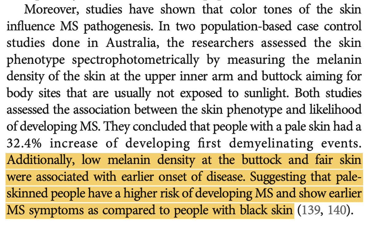 Pale-skinned people have a 32.4 % higher risk of a first demyelinating event and earlier onset… measured by melanin density at sun-protected sites.” (Australian case-control studies)