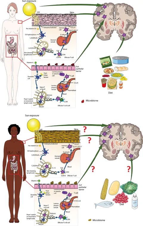 The skin is the dominant “training ground” for T-cells that later patrol the brain, —and melanin density in skin is a key evolutionary switch that explains the global MS gradient (near-zero in equatorial Africa, high in Scandinavia).