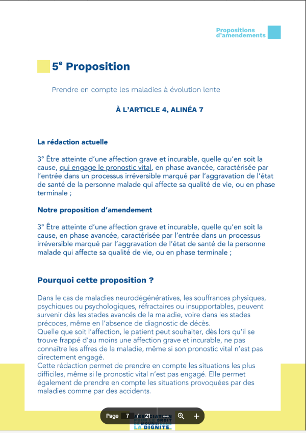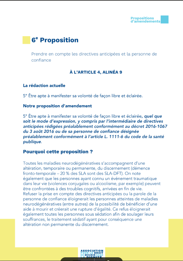 Leur 6ème proposition ouvre la voie à des directives anticipées pr des personnes atteintes d'Alzheimer, par exemple... et qui, dc, ne demanderont plus rien au moment de l'acte. C'est ainsi qu'on a pu, à l'étranger, droguer des gens pr les euthanasier (cf la "koffee-euthanasie)