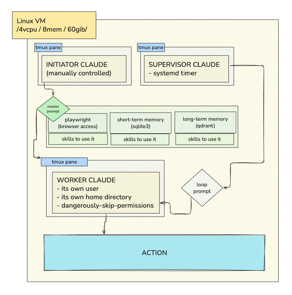 Basically, there are two ClaudeCodes living in TMUX panes. One is the builder, the other one is the "watcher". There is a systemd timer that sends the string "CHECK" to the watcher, and it checks on builder claude /w tmux send-keys commands.