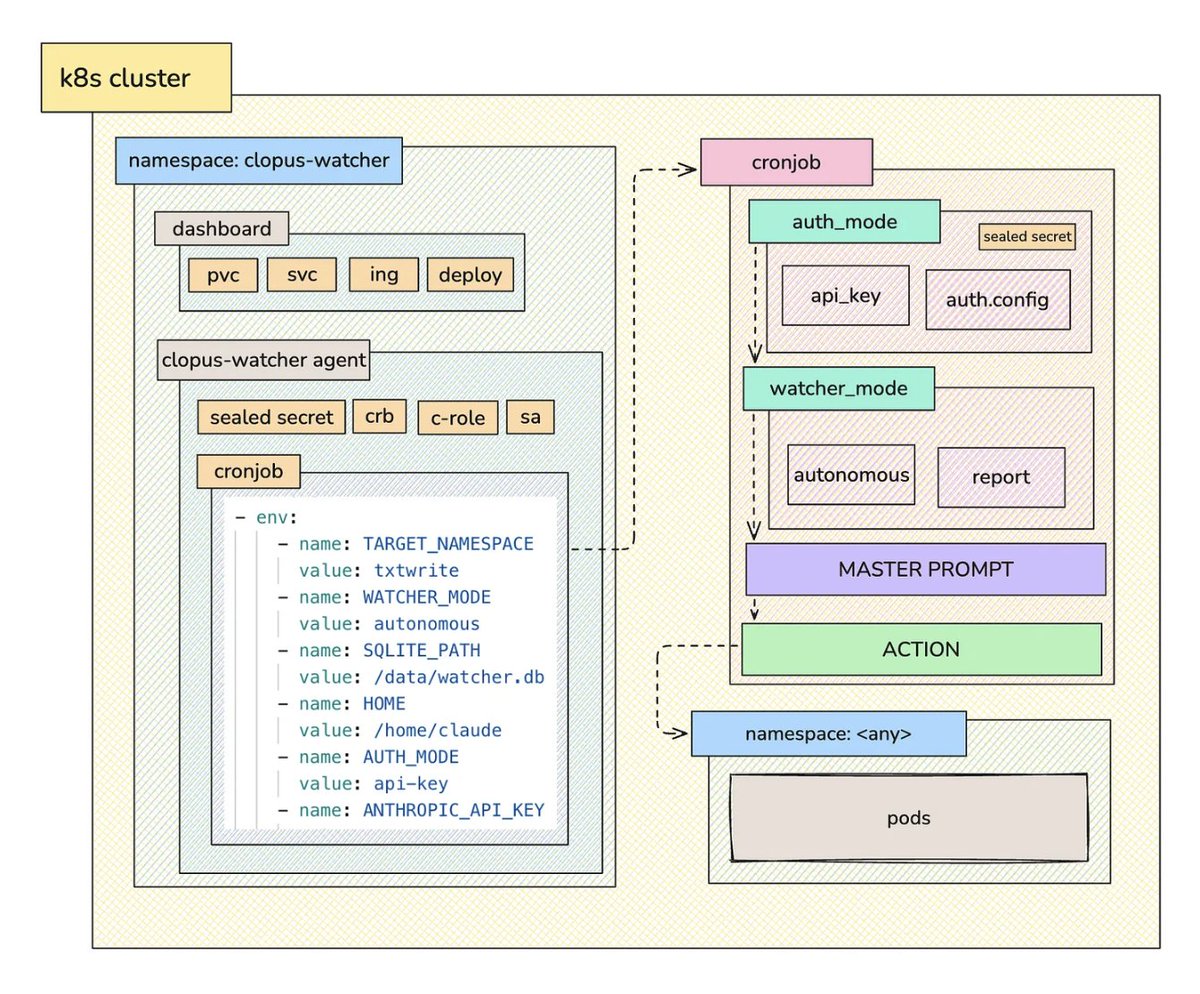 Here is the architecture. It consists of a dashboard & a cronjob with config env vars for auth_mode (api_key/auth.config) and worker_mode (autonomous/watcher). It only monitors namespaces you particularly set for it to monitor.