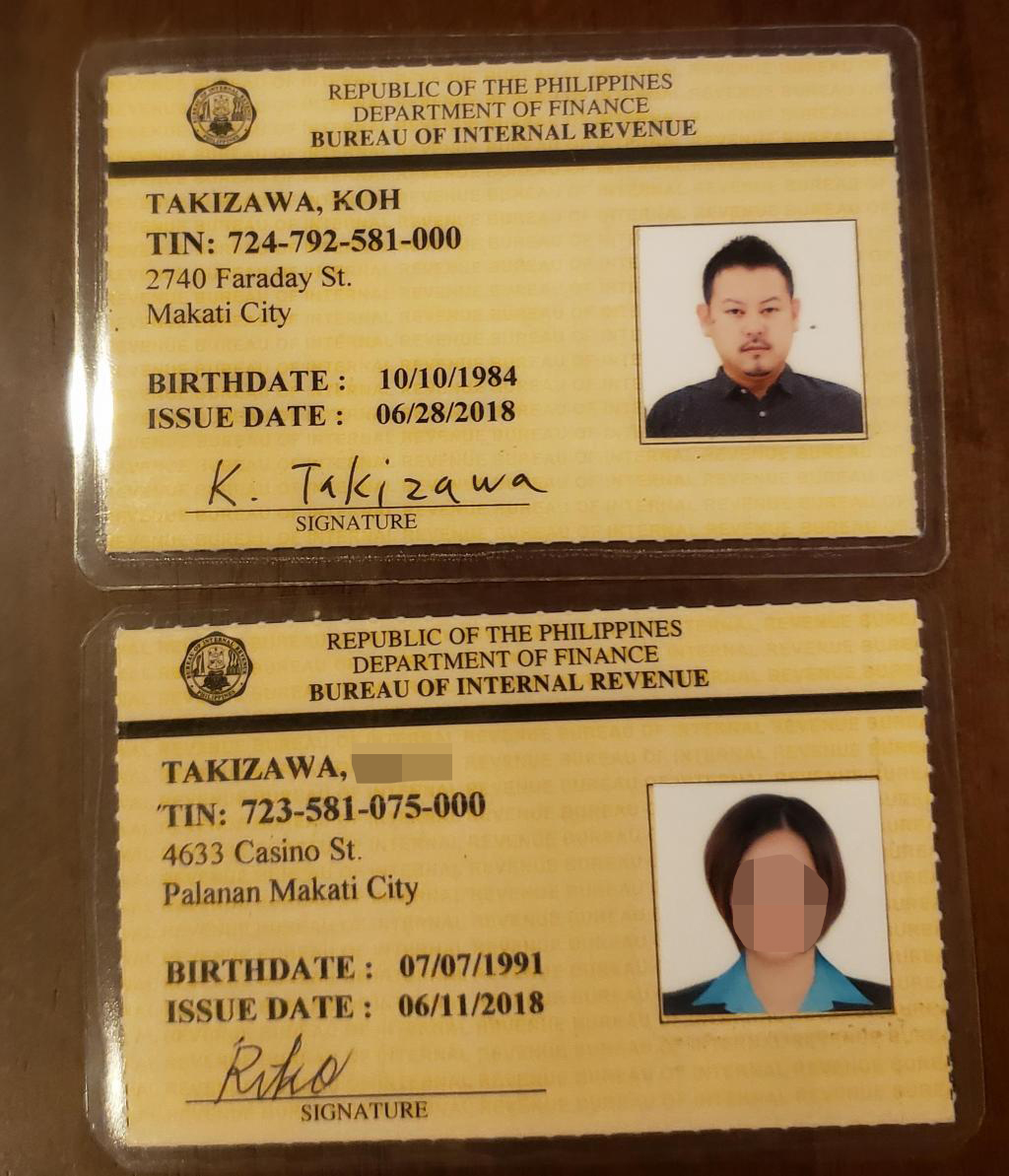 ②黄色い2枚の男女のカードは、上が渡邉氏、下が日本で現金の回収役を行っていた「シマダ」という女性のもの。「TAKIZAWA」というのは偽名です。これはタイからフィリピンに入国する際にイミグレーションで止められないために偽造した外国人の在留証明書。これで銀行口座などを作ることができます