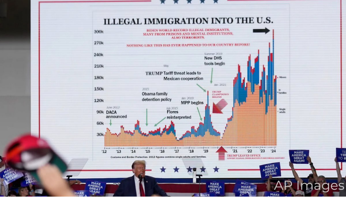 The chart that President @realDonaldTrump credits with saving his life shows the low number of immigrants in 2020, followed by a massive increase in the number of illegal immigrants entering the U.S. by 2024.🧵/1