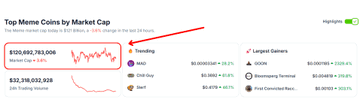 迷因市场价值1200亿美元,约占所有加密货币的3.64%。