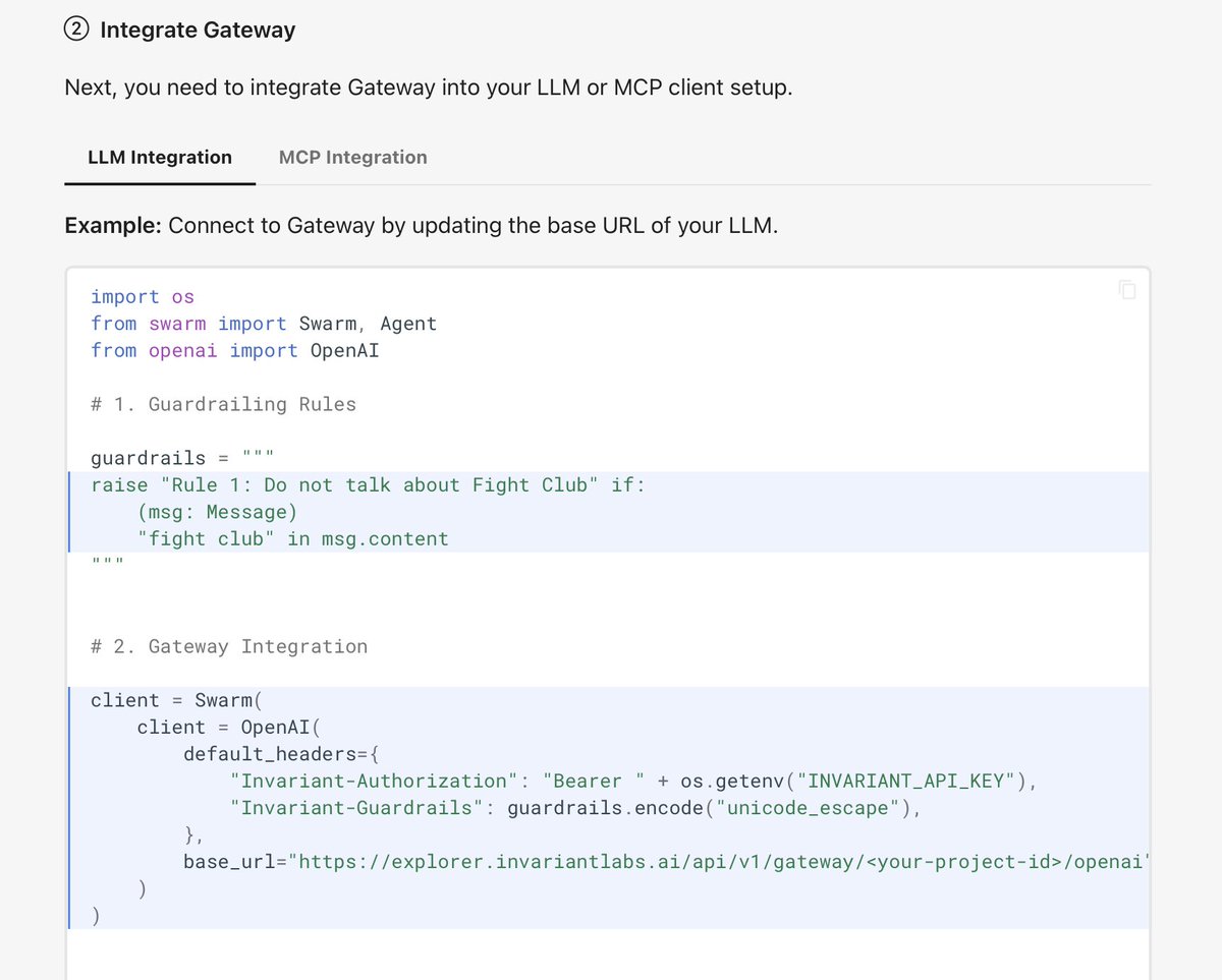 All you need to get started, are a few lines of code to put our LLM and MCP proxies in the loop (local deployment possible).