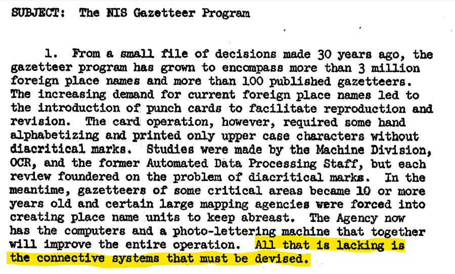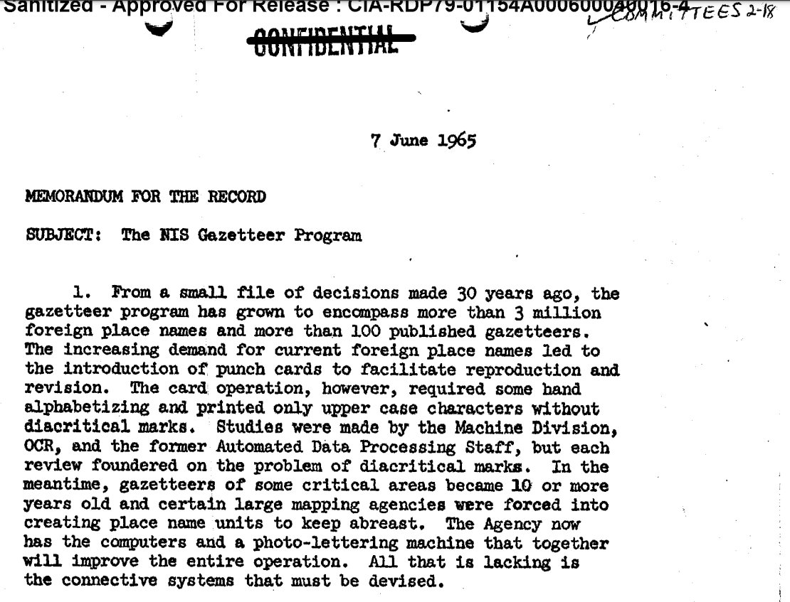 Information about the NIS Gazetteer program can be found all over the CIA Reading Room, but here's a good place to start: