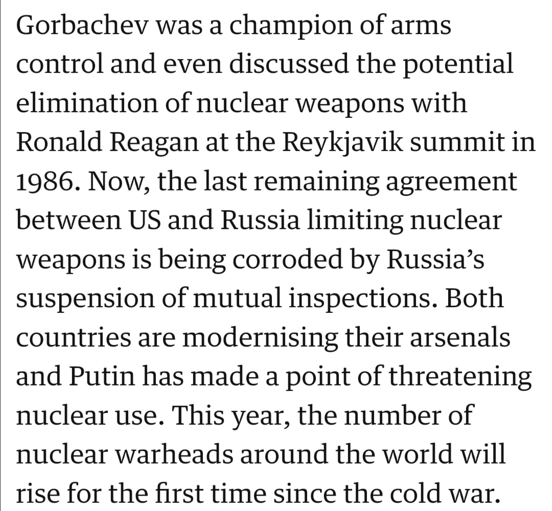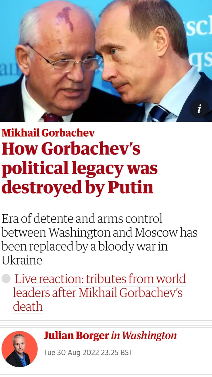 Borger says Putin destroyed Gorbachev's legacy turning a blind eye to what transpired in between Gorbachev and Putin: a decade of unbridled oligarchy and a poverty free-for-all under Yeltsin