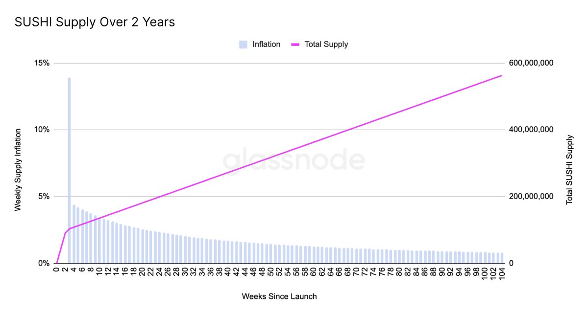 📈 Inflation: Two years from now, @SushiSwap's native token will have reached a supply of almost 600 million.