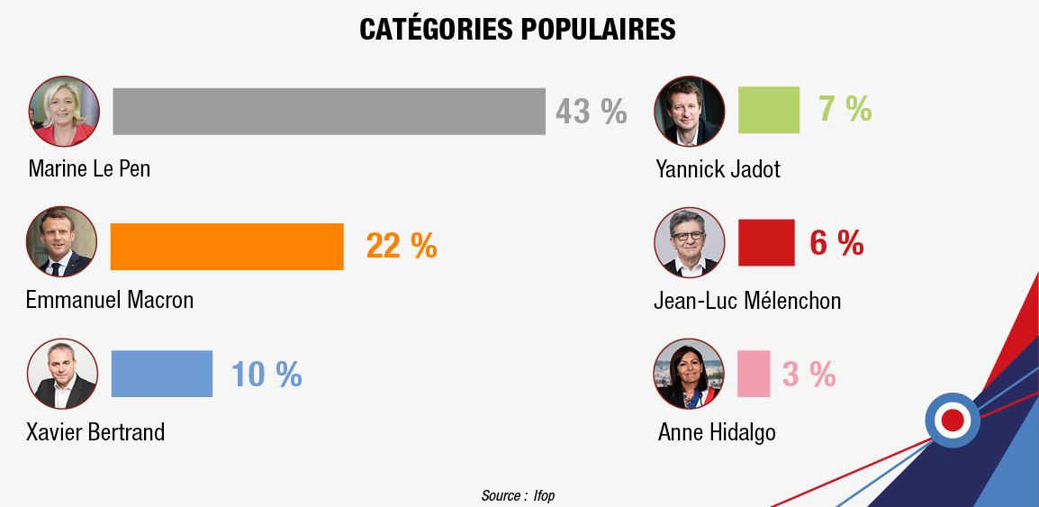 1. Catégories populaires : Le Pen est à 43%. Mélenchon est loin derrière avec 12%. La gauche écolo-socialiste est à la masse : EELV 4%, PS 3% (Hidalgo est à 1% chez les ouvriers🧐). Les tracts en écriture inclusive, la décroissance, le sociétal au dessus du social ça marche pas.