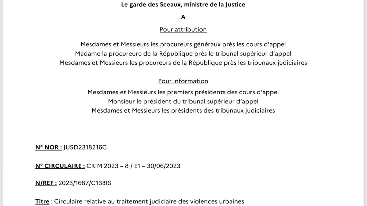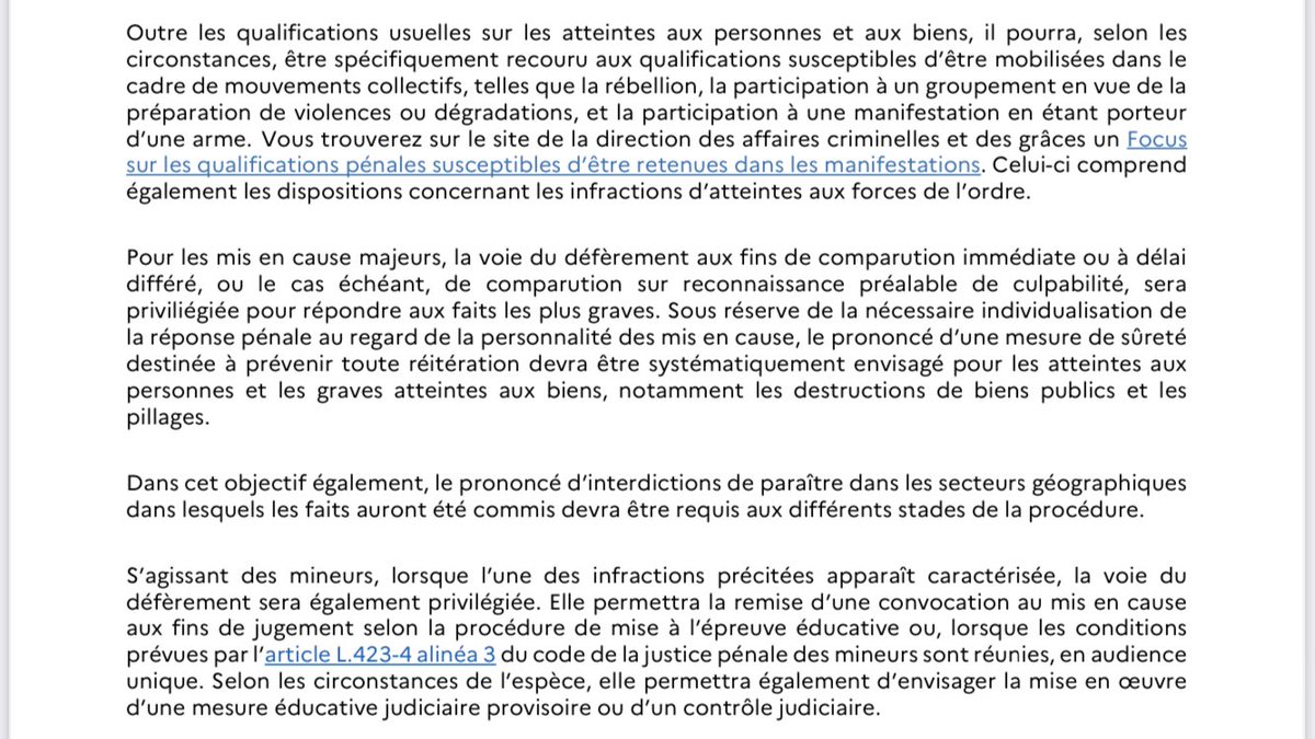 @E_DupondM vient de sortir une circulaire scandaleuse à destination des magistrats (et notamment du parquet) sur le traitement judiciaire des personnes arrêtées suite aux mobilisations #JusticePourNael