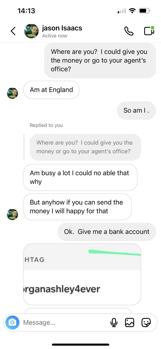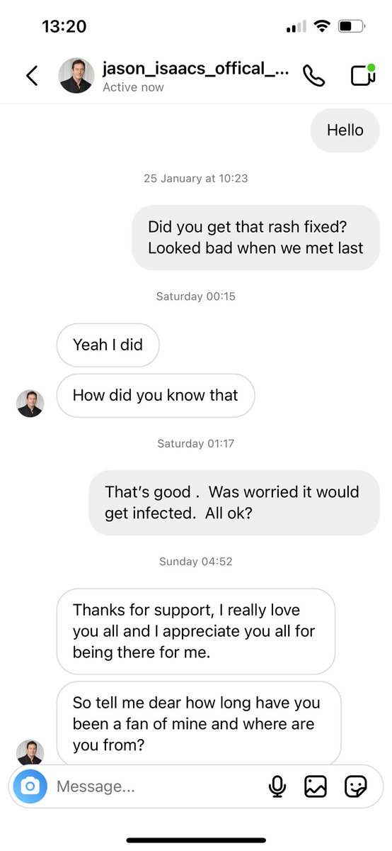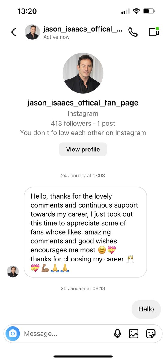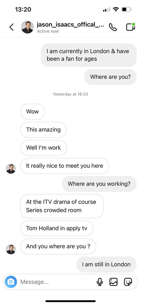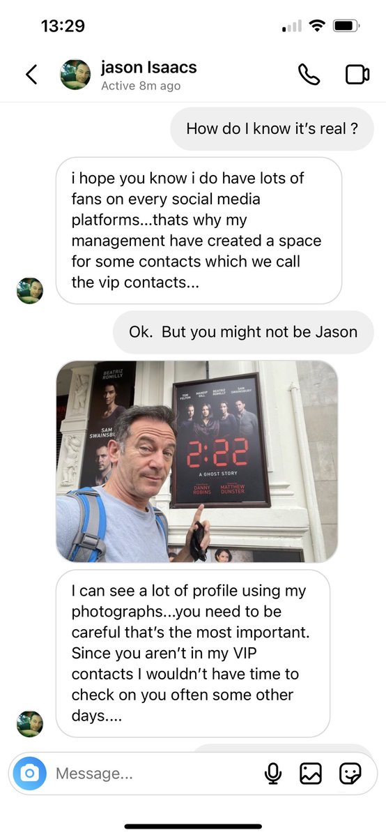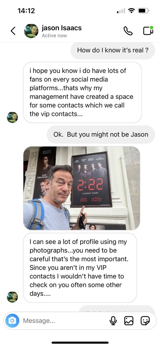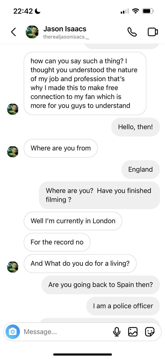 Full & in order messages with this Jason Isaacs spammer. Careful - this guy is posing as many famous people & is probably getting money from some. After trying to spam a 15 year old I got annoyed