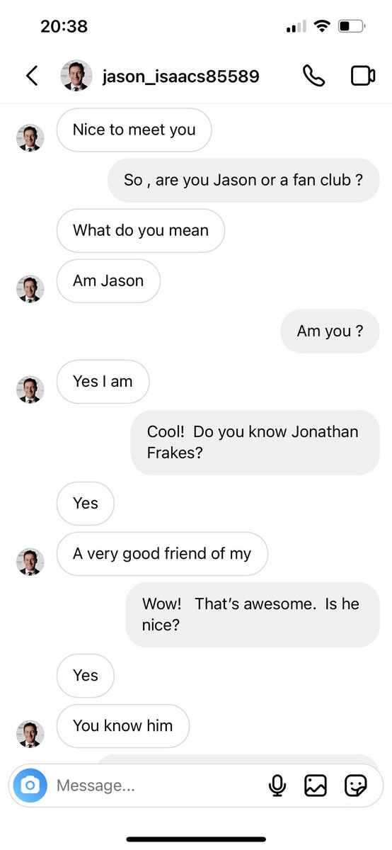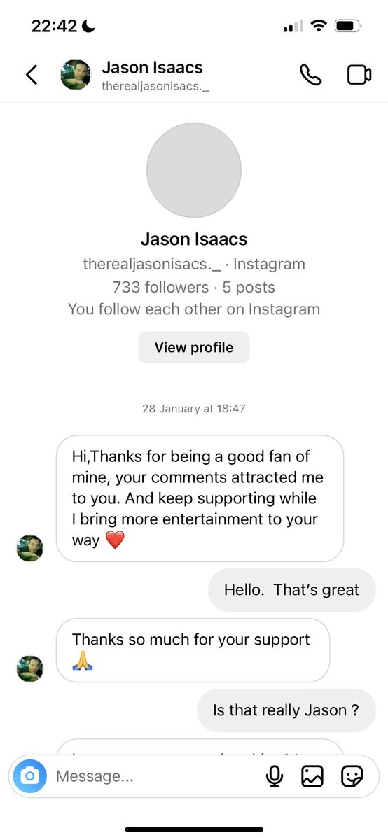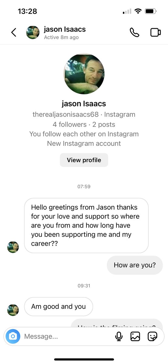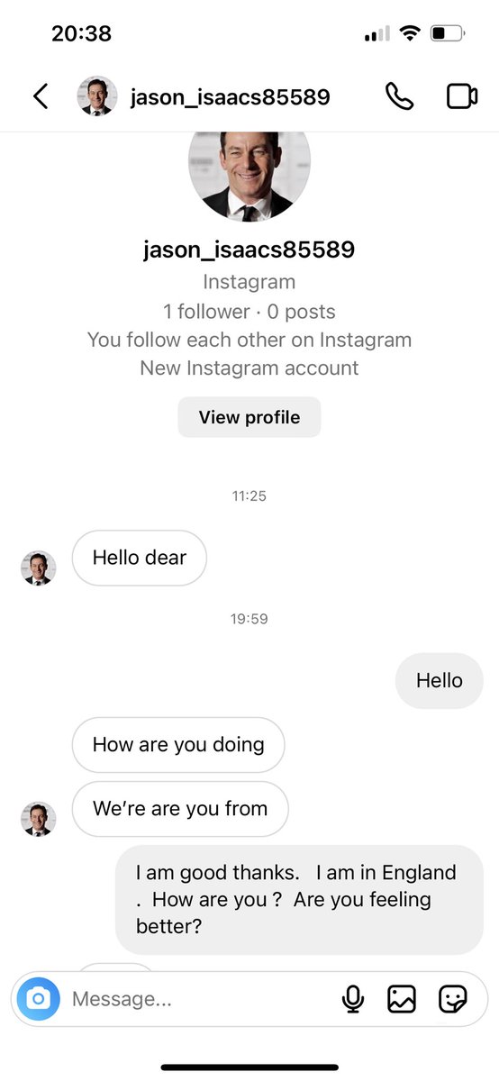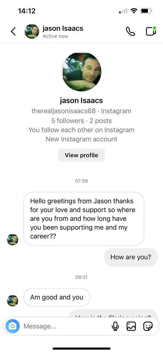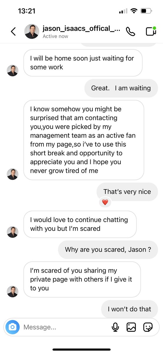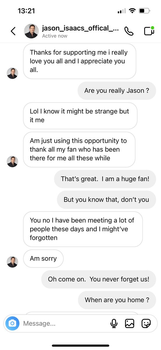 This guy has been messaging people on Insta to try to get money & phone number - pretending to be Jason. He did this to a 15 year old. So I thought I should check. I know … but I was annoyed