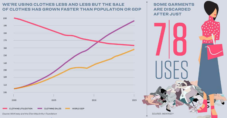 Desde principios de la década de 2000, la producción de la ropa a nivel global se ha duplicado y su número de usos reducido, con descartes de ropa tras solo 7-8 usos.