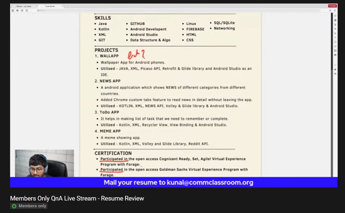 In today's Livestream he reviewed some resumes and gave some tips and tricks.