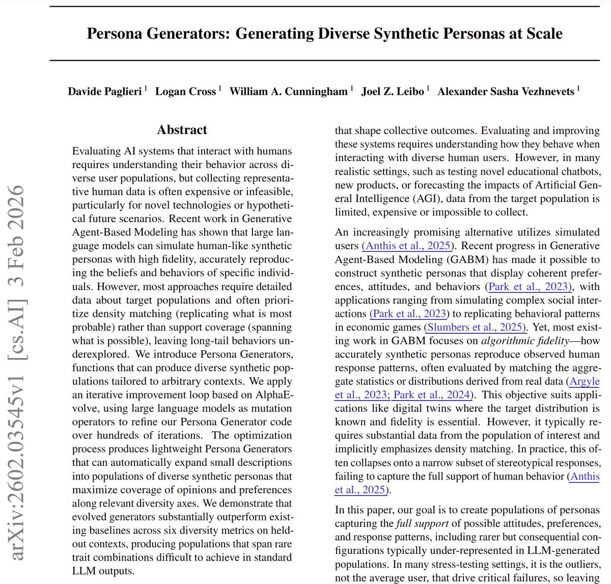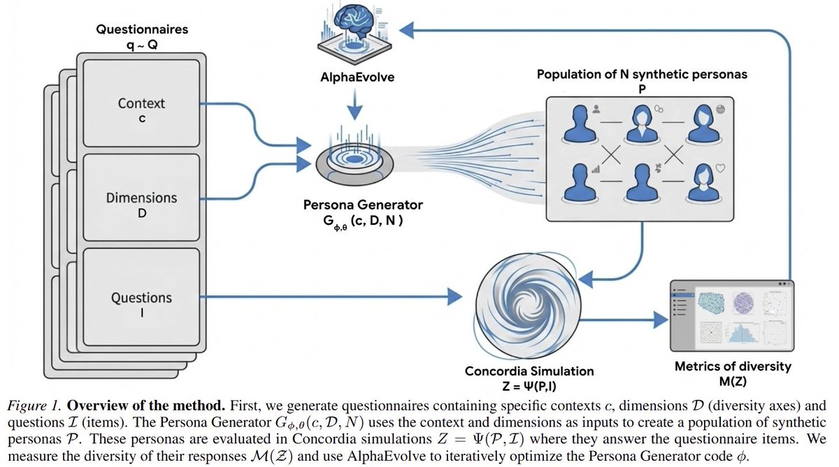 설문을 생성해서 그 맥락과 다양성 축 정보를 이용해 생성기를 통해 페르소나를 생성 -> 각 페르소나로 설문 문항에 대답해 실제로 다양성이 높은 답변이 나오는지 신호를 이용해 AlphaEvolve 메커니즘을 적용해서 generator를 최적화