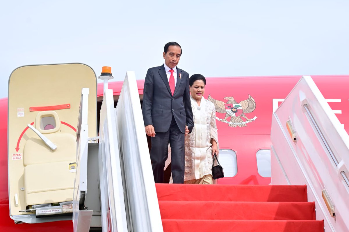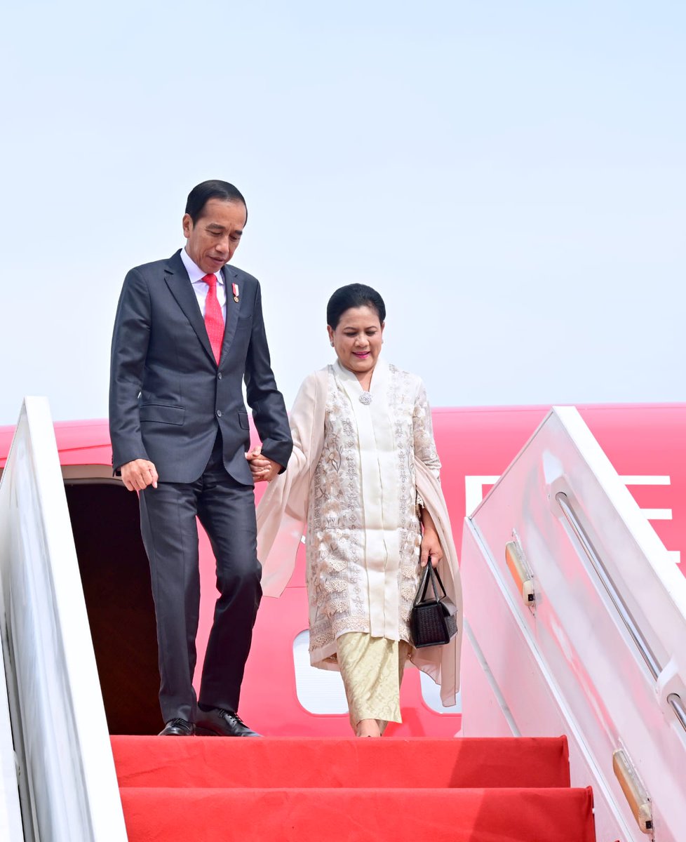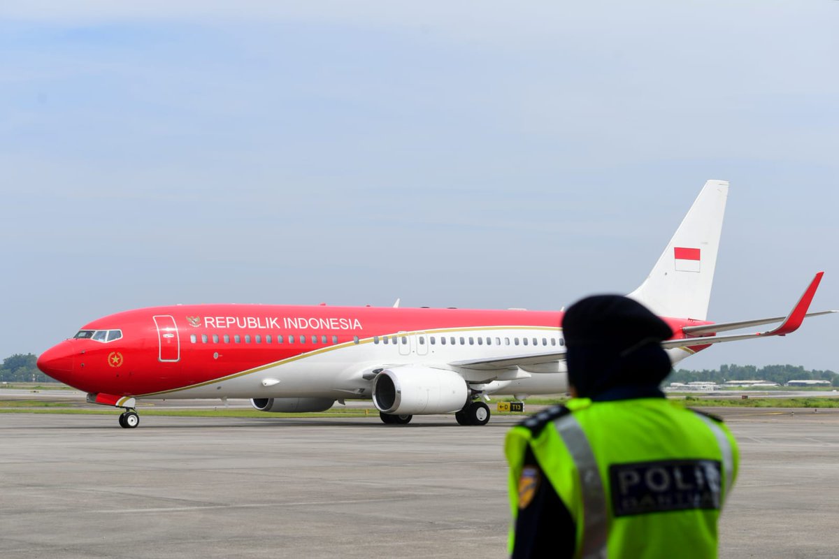 Pesawat Boeing TNI AU 737-400 yang membawa Ibu Iriana dan rombongan tiba di Bandar Udara Internasional I Gusti Ngurah Rai, Kabupaten Badung sekitar pukul 09.10 WITA.