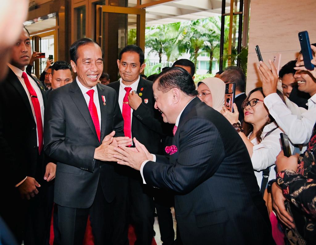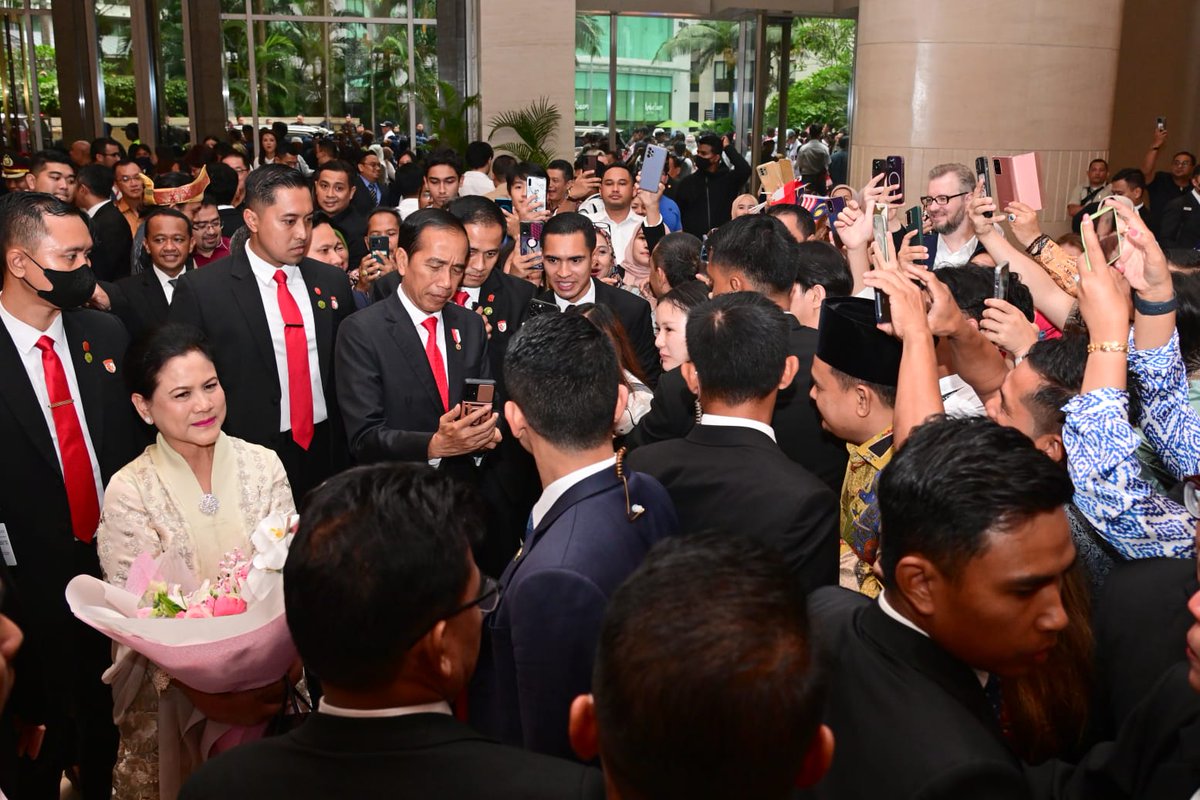 Kedatangan Presiden @jokowi dan Ibu Iriana di hotel diiringi hadrah yang dibawakan oleh Pengurus Cabang Istimewa Nahdlatul Ulama Malaysia. Di depan hotel, Presiden disambut oleh Wakil Dubes RI untuk Malaysia Rossy Verona dan suami.