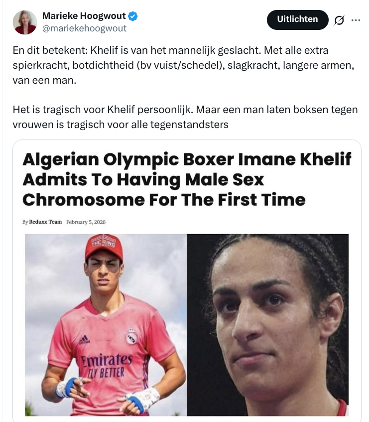 Als het volgens X onder EU-wetgeving "illegal of harmful" is om te zeggen dat het bezwaarlijk is dat er mensen van het fysieke mannelijke geslacht tegen vrouwen boksen, is de veiligheid van vrouwen de facto afgeschaft. Niet acceptabel. No way